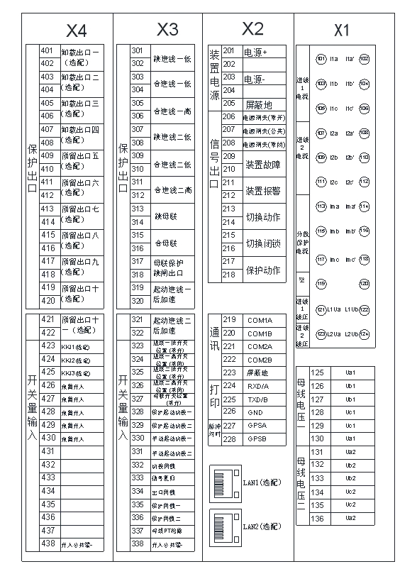 301-316接入进线一、进线二和母联开关分合闸指令,317-318接入母联保护跳闸指令,319-322接入起动进线一、进线二后加速指令。206-210接入装置故障指令。211-212接入告警信号,一般为后备电源失电或PT断线。213-218接入装置动作信号,包括切换动作、闭锁动作、保护动作。