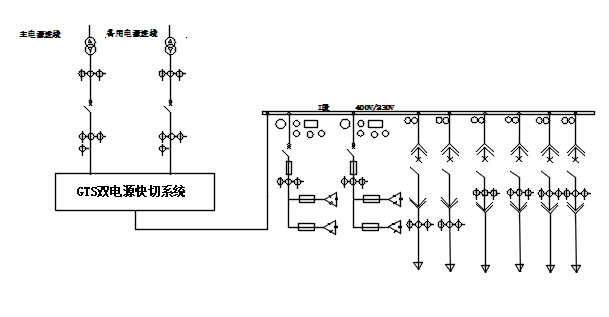 GTS双电源快切系统安装于0.4kV配电系统,安装位置与系统示意图如下: