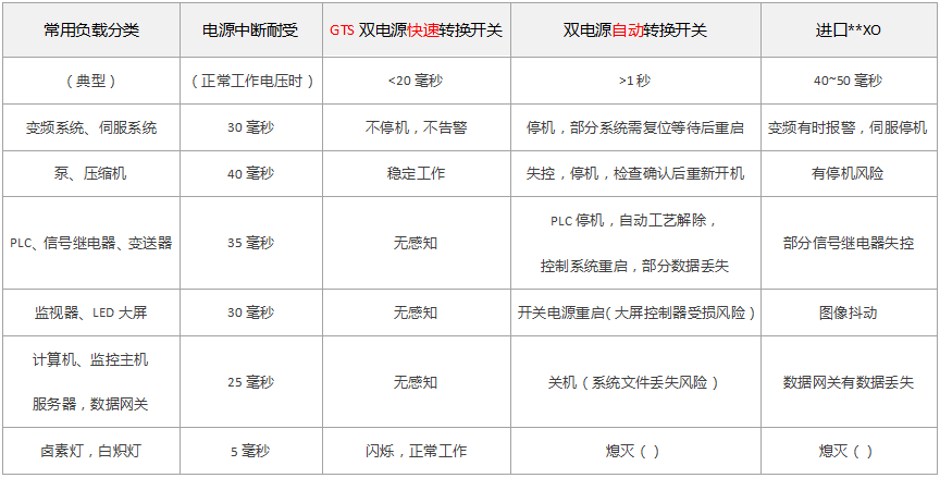 GTS双电源快速转换开关不同于普通ATS双电源自动转换开关应用在当常用电源发生晃电故障时通过备用电源快速安全切换,来确保负载连续供电。常规ATS(双电源自动转换开关)因采集、控制、灭弧工艺等限制,备用电源安全投入需等待数秒甚至数十秒时间,大多数负载尤其是工业连续负载如:电机、变频、PLC控制及各类自动化控制系统,全部停机,严重影响安全生产、经济效益甚至引发生产事故。